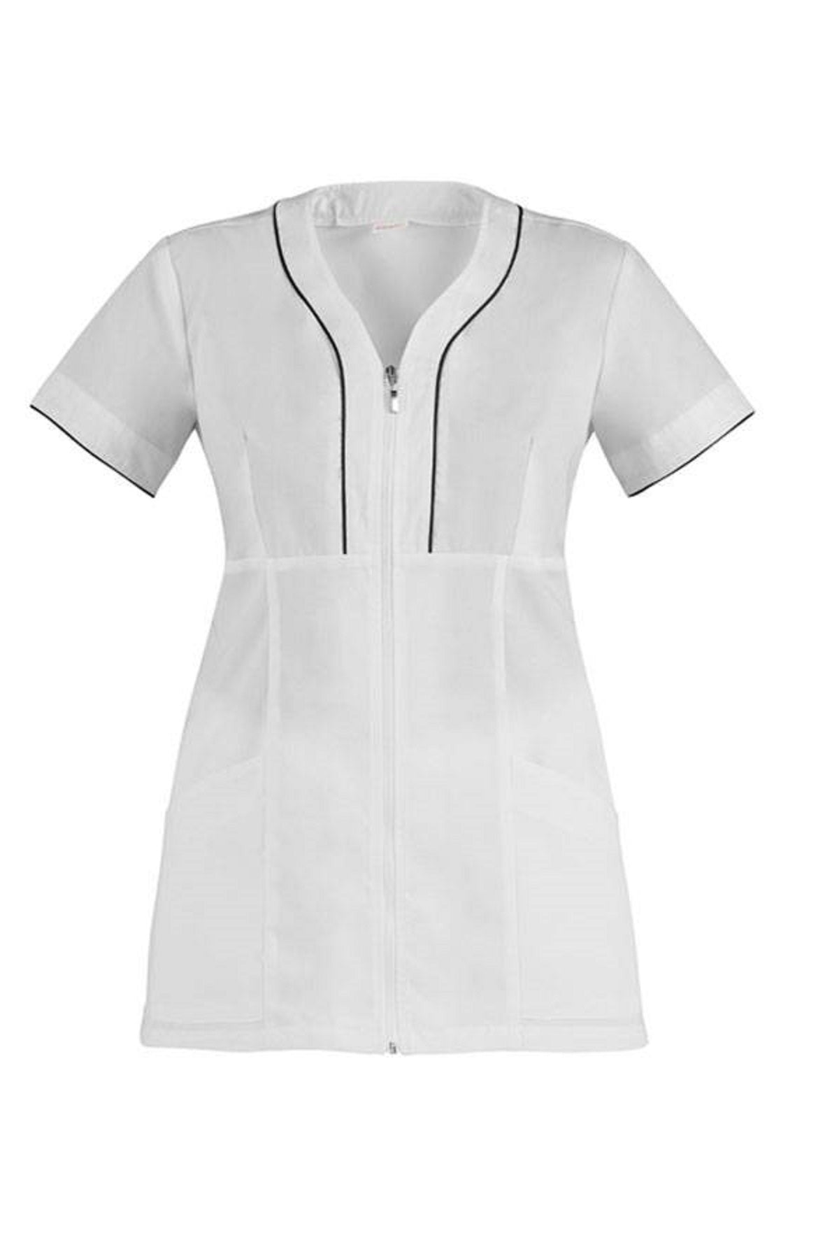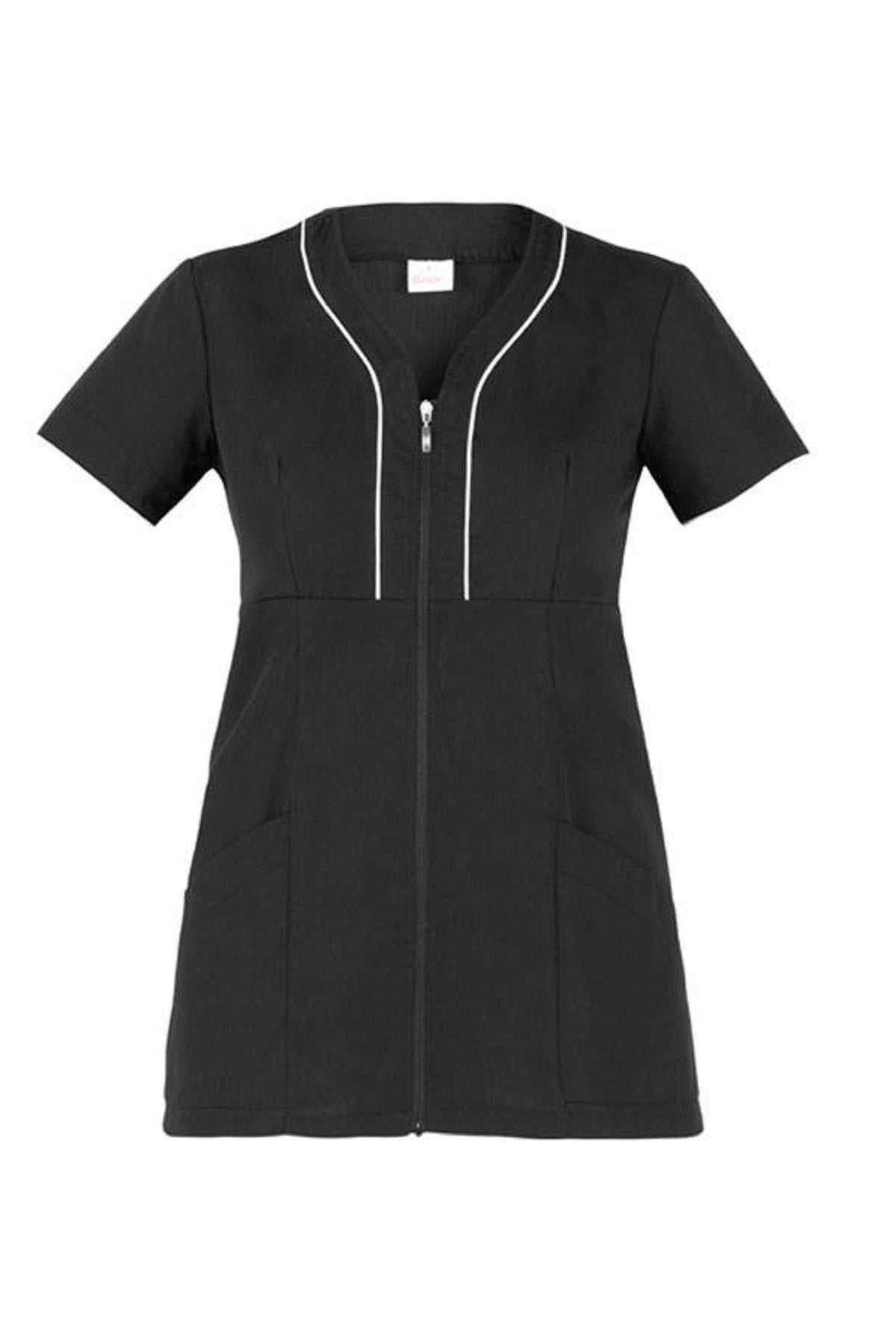 Modello: maniche corte, taglio femminile aderente, con 2 tasche e zip, con strisce colorate a contrasto, lavabile a 60°C, stiro facile