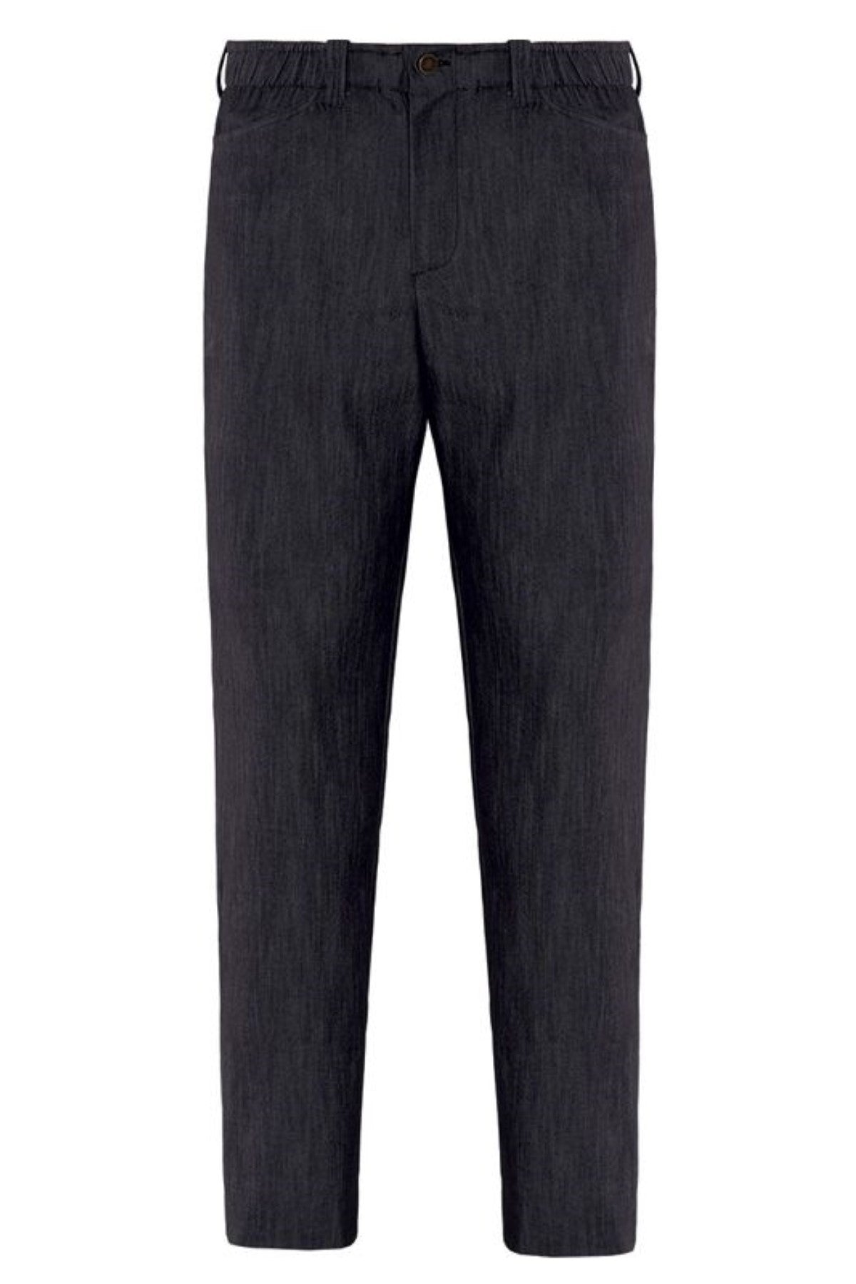 Modello: classico, con passanti per cintura, elastico in vita tergisudore, chiusura con cerniera, con patta e 1 bottone, 2 tasche anteriori applicate, 2 tasche posteriori